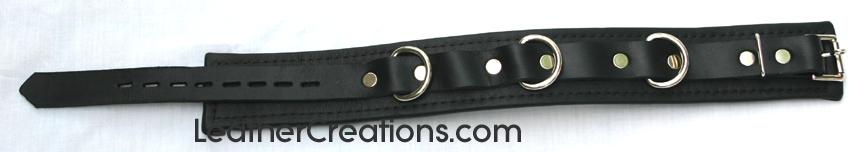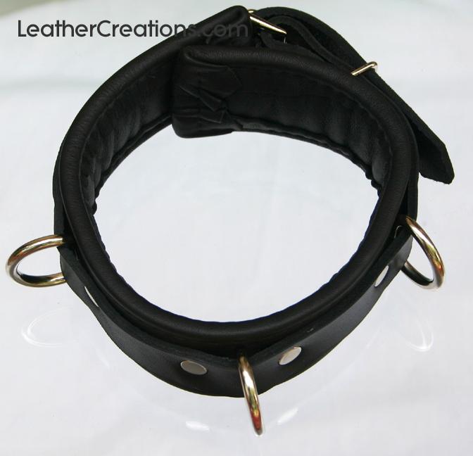 Click for larger | If you know me, you know I am not a fan of comfy bondage, but a lot of you are, and this will certainly fit the bill. This is not just a latigo collar (like our bondage collar ), that is covered in a high quality garment leather, but it has a layer of foam padding encased under the leather on the bottom's side for even more plush comfort! Don't be decieved, this will still hold him down just as much as the non-padded version - nothing flimsy about it! #1331 - $49.63   |
