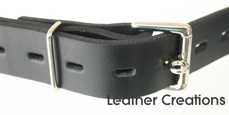 This is a little different than our wider bondage belts, and is offered in this 1 1/4" size as well as a 1" size. Utilizing a locking tongue buckle, this is punched with slots the entire length, from 8" from the buckle (the leather won't pull any tighter than that), all the way to 1 1/4" from the end. Like our other bondage belts, it is made of the same high quality Latigo leather. These can not only be used as bondage straps / belts, but you can also use them as a regular belt as well. The tongue functions normally without a lock, but toss a little padlock (not included) int the loop in the tongue, and it is on to stay. We will make this up in any size you want. You have to remember that this is leather, and leather comes from cows, and cows aren't the size of a tractor trailer. Usually anything up to 6 feet is a piece of cake. We often have even up to 7, and on the rare occasion we have hit 8. If you order something that is bigger than the biggest hide we have around, we will let you know, as well as when (and if) our tannery can supply the size hide necessary. You can order up to 20 belts using this page. If you are ordering more, there is a space below to enter your email address to request a custom order (no obligation, of course). Decide how many belts you want, and the lengths. In the first row, enter the total number of belts, as you will need one buckle assembly for each. Next, specify the length for each belt, using the next 20 boxes. Obviously, if you only want one, you only need to use the first and second box, but you can order up to 20 different sizes if you wish, or up to 20 all the same. You must (because our shopping cart won't let us do it another way), put only one belt on a line. Therefore if you want, say, 20 48" belts, you must enter 48 in each of the 20 boxes. The cart will track each belt length separately, and transmit the information to us. The minimum size is 15". There is no maximum, as long as we have a big enough hide. Use this for play, or to hold up your pants and have something handy when the right person comes along!