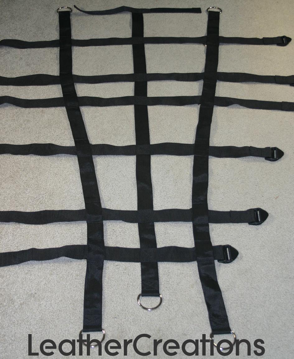 Click for larger | A full body restraint system, much like a gibbet, custom made to measure! Where to start on this new design by my boy Scrappy? It started life as a way to increase intensity in a sleep sack. Realizing that not everyone has a sleep sack it was tried as a stand alone item. Then the hands could get loose and open the straps, so a very simple, and totally effective wrist restraint (removable) was added. The end result is this extremely comfortable yet totally immobilizing restraining system. This is a totally custom piece. It doesn't have to be (I'll explain later), but it comes made to your measurements for this price. So why doesn't it fit the model exactly right? Because it wasn't custom designed for him. Scrappy and I will rectify that and I'll get some new photos, but I wanted to get this listing up now, not next week. It features: Strong, fully 2" wide webbing at all points (except the neck is 1 1/2" and super soft, so as not to choke or chafe) As I said, this is, or can be, made to your measure at no additional charge. It also comes as a generic fit for someone 5'11" and if you want it for multiple partners that might be your choice instead. Measuring is simple, just take a look at the measurement instructions to see what you need to do. The body straps are amply sized to fit just about anyone, and can be altered to lengthen them if you are in the plus plus size category. Please send me a message if you think that might be a need. So get ready to settle in for a pleasant afternoon, or an enforced all night rest with Scrappy's Full Body Restraint!