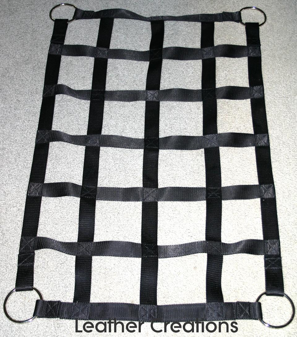 This is actually a photo of the nylon - we will get a poly photo up ASAP! Click any photo for a larger image | We make our heavy duty nylon slings , and these are exactly the same thing, but made with poly webbing instead. Nylon webbing is a hell of a lot more expensive than nylon, and when we started making our Poly bed bonds , our Modular Bed Bondage system , and our Full Body Webbing Harness Restraint out of poly, and everyone said that they enjoyed their purchases, we decided to make our two most popular woven slings out of it as well. I will be 100% honest and tell you that the nylon is a little more comfortable against the skin than poly. At the same time, two points: 1) Poly is far from uncomfortable, and 2) sometimes as Rhett would say, I just don't give a damn! Check the close up photo for a comparison between the two materials. There is plenty of strength in the poly webbing. These are both made with cross hatched stitching wherever the poly crosses, and heat sealed ends which are tucked under an extra fold. This extra work means that these are going to last! An extra benefit is that they are washable too! We think you'll find these very comfortable, and great fun to play in! Our basic slings are 18 X 33 inches in size, jumbo slings are 24 X 38. Chain and clips not included. |