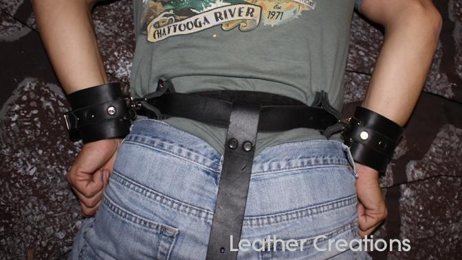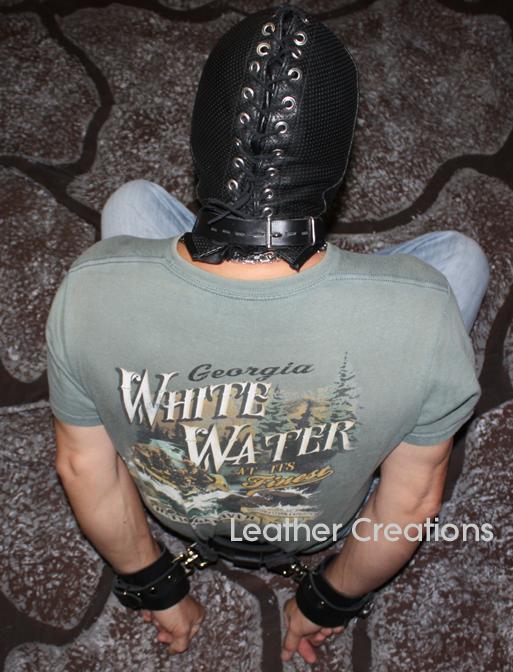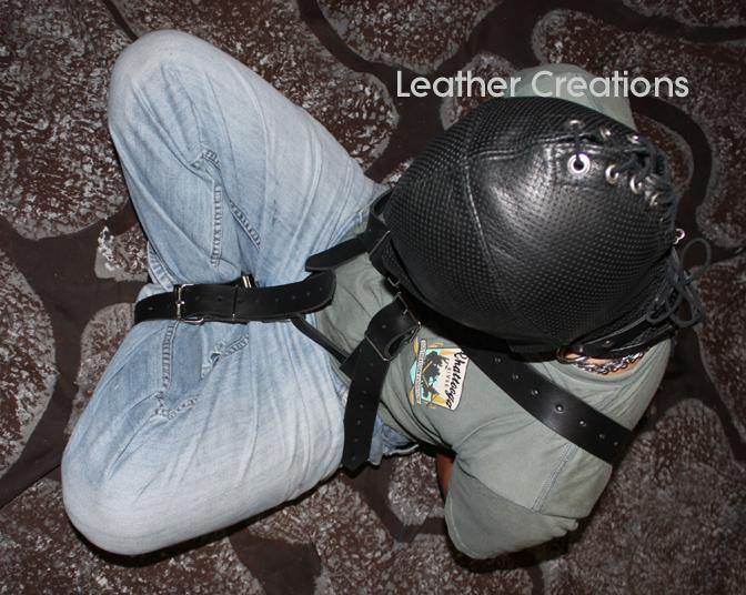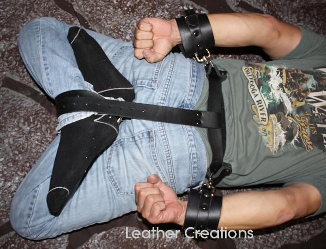 | Have to give credit to one of my boys (yes, the little muscle guy in the pictures) for this fantasic (and evil) device. He has a latex hog sack, loves it, but not everyone can afford the money you need for a good one. He figured we could come up with a way to be in the same position (actually, this can be a lot worse than a hog sack, if you want it to be), and with his help, this was born. The basic unit accomplishes the bound leg and wrist position. And a tough one it is! The hands get locked (padlocks not included - not necessary for use, only for locking) behind the back to the included belt. The (included) ankle strap stops any sideways motion (and yes, it is long enough for boots), and the crotch strap pulls the legs up folded, tight, and immobile! Won't be long before you want out of this one! As if this is not enough, he wanted to be bound in an even tighter ball (never said he wasn't a bondage pig), and we added the shoulder strap option seen in some of the photos. This pulls you up even tighter, and folds you over into a small ball... and ball is the operative word, a little push and you are rolling over if you like it or not. This basic unit can also be used in an on the back or stomach position (shoulder straps don't have to come off, but don't do much when lying down), and we even include the longer leather strap to allow the hands to rest comfortably but immobily at the sides when lying on the back, instead of tightly behind the back where they belong when sitting. Just check out the photos. The strap changes quickly with two screws and a standard screwdriver. Crafted in our shop using high quality leather, and screw posts instead of rivets at stress points. The wrist assembly, which takes a lot of force once you are tied, is even made with double layers of our extra strong leather. The wrists are attached to the belt with swivels. You'll go nowhere, but you won't be forced into a painful and awkward wrist position. Self bondage (oh come on, admit it) is also possible. Remove the strap connecting the wrists together, strap on the belt, then your legs in as hard as you can take it, pull the shoulder straps tight, and if you are really good, you can now even slide your hands around and buckle yourself into the wrist restraints! See how long you can stay that way. Comes unassembled due to new postal regulations on oversize boxes (we would have to add quite a bit to your shipping charges). Trust me, not like an Ikea piece of furniture, all you need to do is slide the pieces on to the belt. Instructions are included with the box, and there are pretty color photos on our little strap diagram . So get serious about tough bondage - you or your victim will love it!