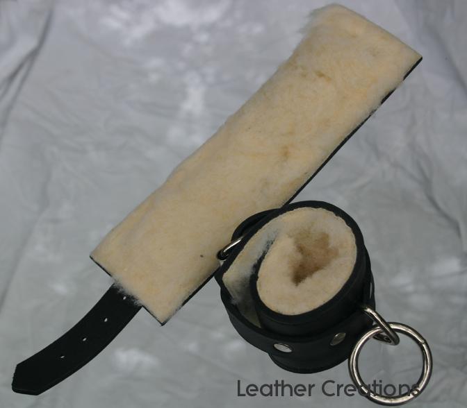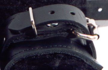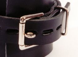 | We call these "standard" wrist restraints, because they are kinda like what you would expect to see in a wrist restraint. We have other devices for restraining the wrists as well, and they are pictured elsewhere on the site. In the table below you will find the available combinations of hardware and lining. The photo at left shows #527, which is the unlined with Loop and D ring. In the photos below are other combinations, and you can also look at our ankle restraints for more photos, as they are made exactly the same, only longer. We use only synthetic lining as we feel that synthetic is far superior to natural because of its resistance to rotting and mildew. All are 3" in width. As if that's not enough to deal with - you also have to choose if you would like locking buckles! There is no stock info on these items. Due to the wide variety of styles, we have decided to make them up to order. They are almost always ready in 24 hours or less. |